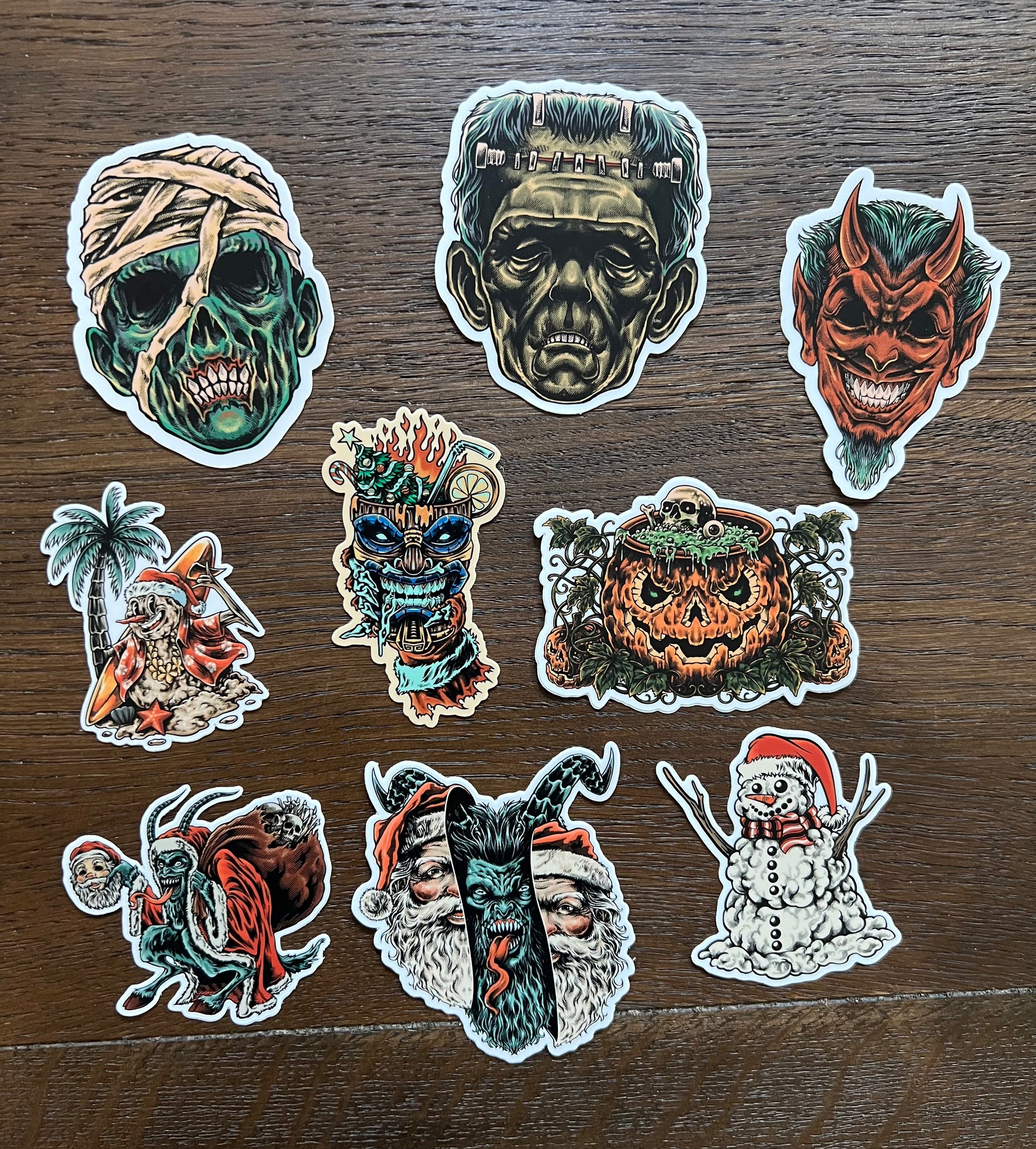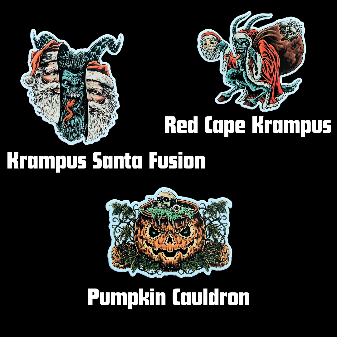 Why settle for just three when you can snag five of these creepy-cool vinyl stickers for the ultimate monster mash-up? From wicked Krampus and evil snowmen to grinning pumpkins, undead classics, and devilish retro heads — you choose your own nightmare (or holiday cheer) combo from 8+ original designs.